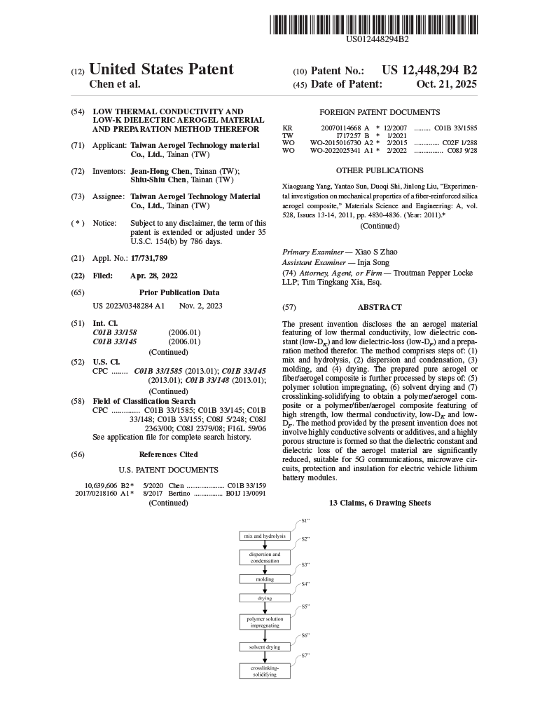 兼具低熱傳與低介電氣凝膠複合材及其製備方法 (美國)