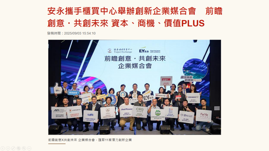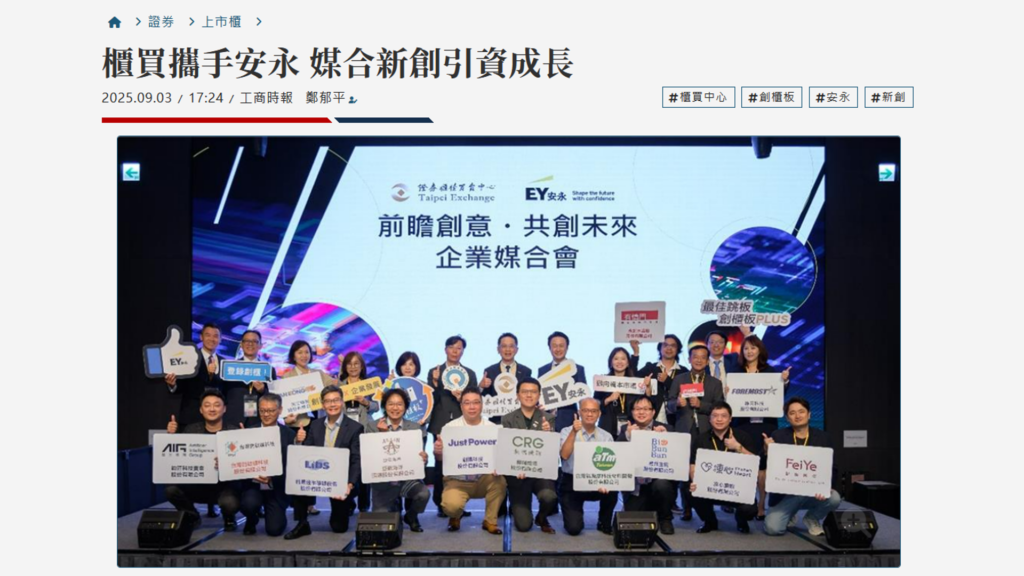 2025 年 9 月 3 日, 證券櫃檯買賣中心(櫃買中心)攜手 安永聯合會計師事務所(安永)共同舉辦「前瞻創意 × 共創未來 企業媒合會」,聚焦創新材料、能源儲能、半導體設備、文化創意與連鎖餐飲等產業,匯聚 11 家具有潛力的新創企業,展現台灣創新能量。